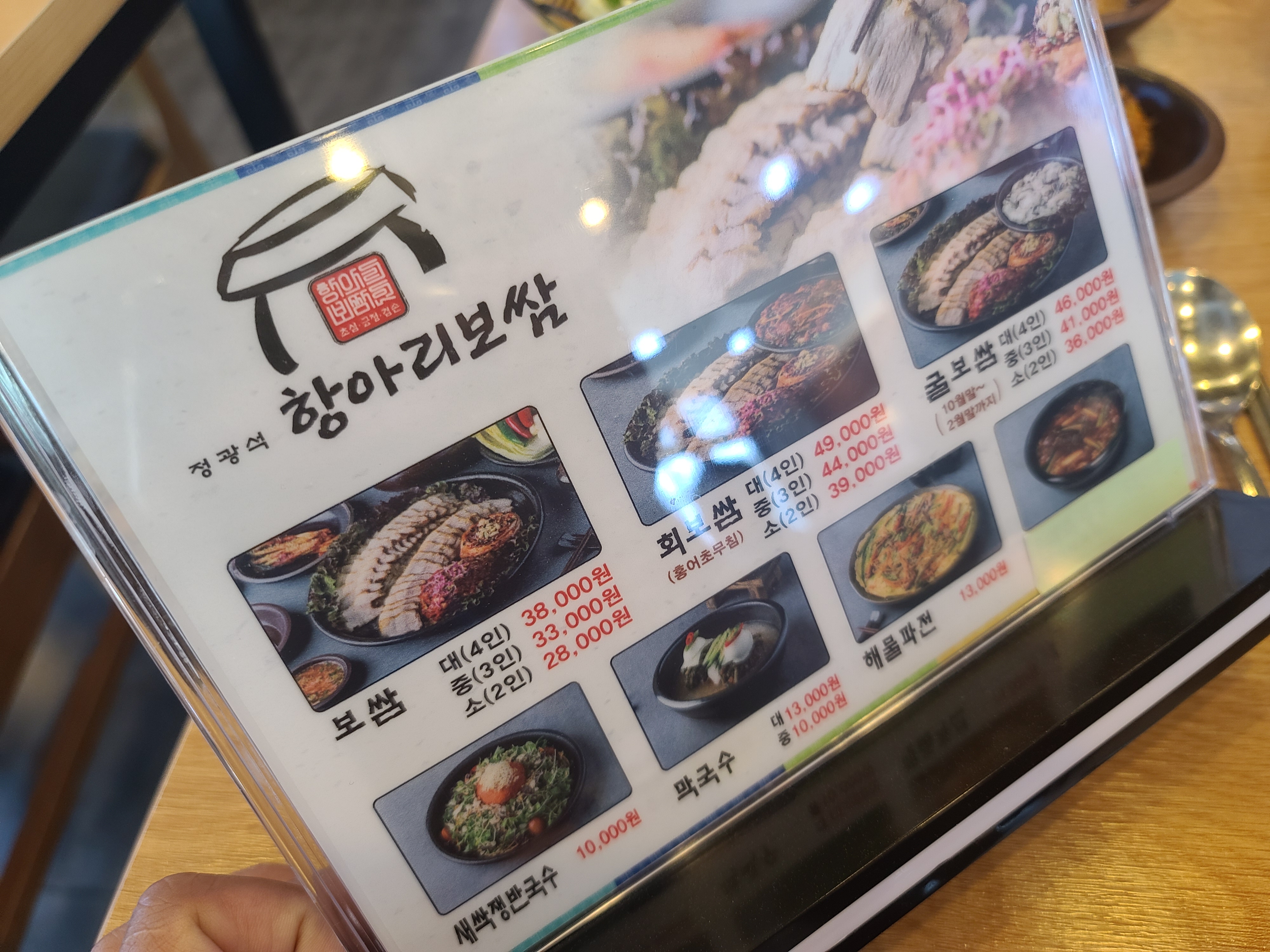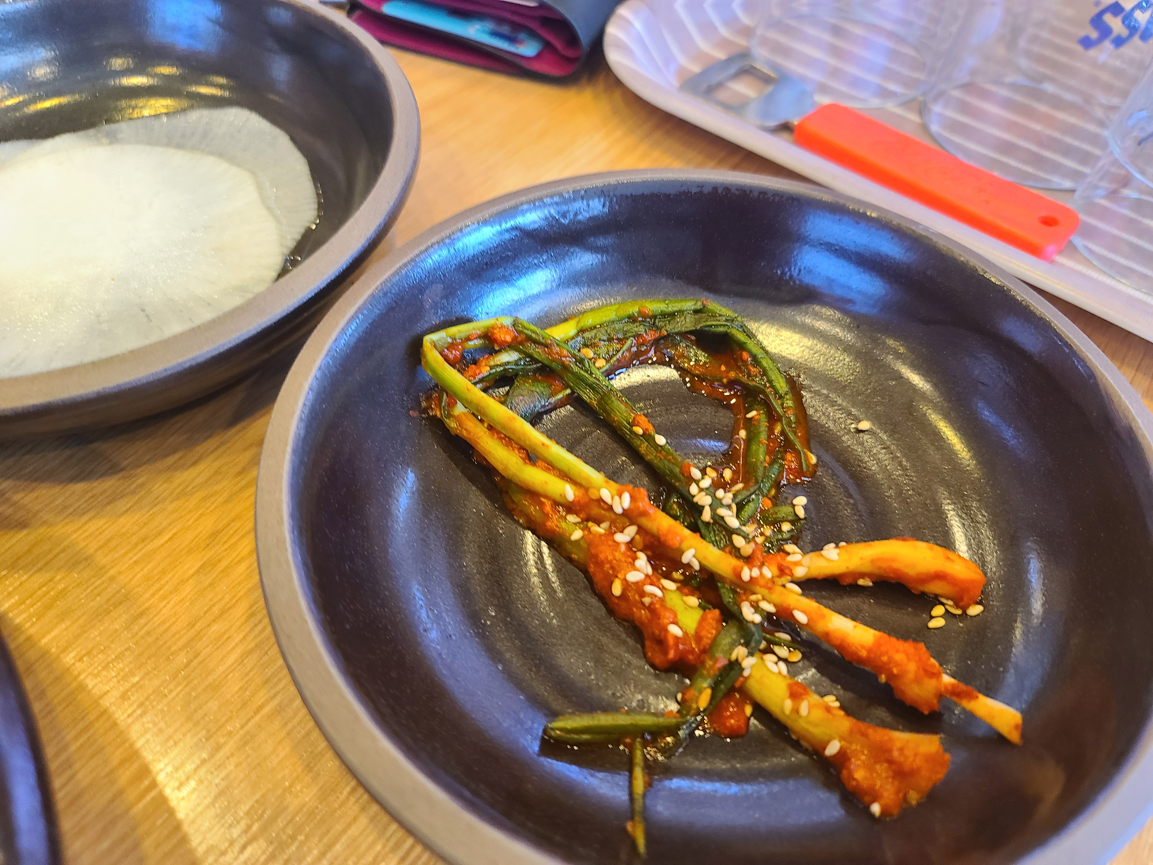 기본반찬 세팅으로는 무쌈, 파김치, 쌈장, 새우젓, 생마늘, 쌈채소가 나온다.