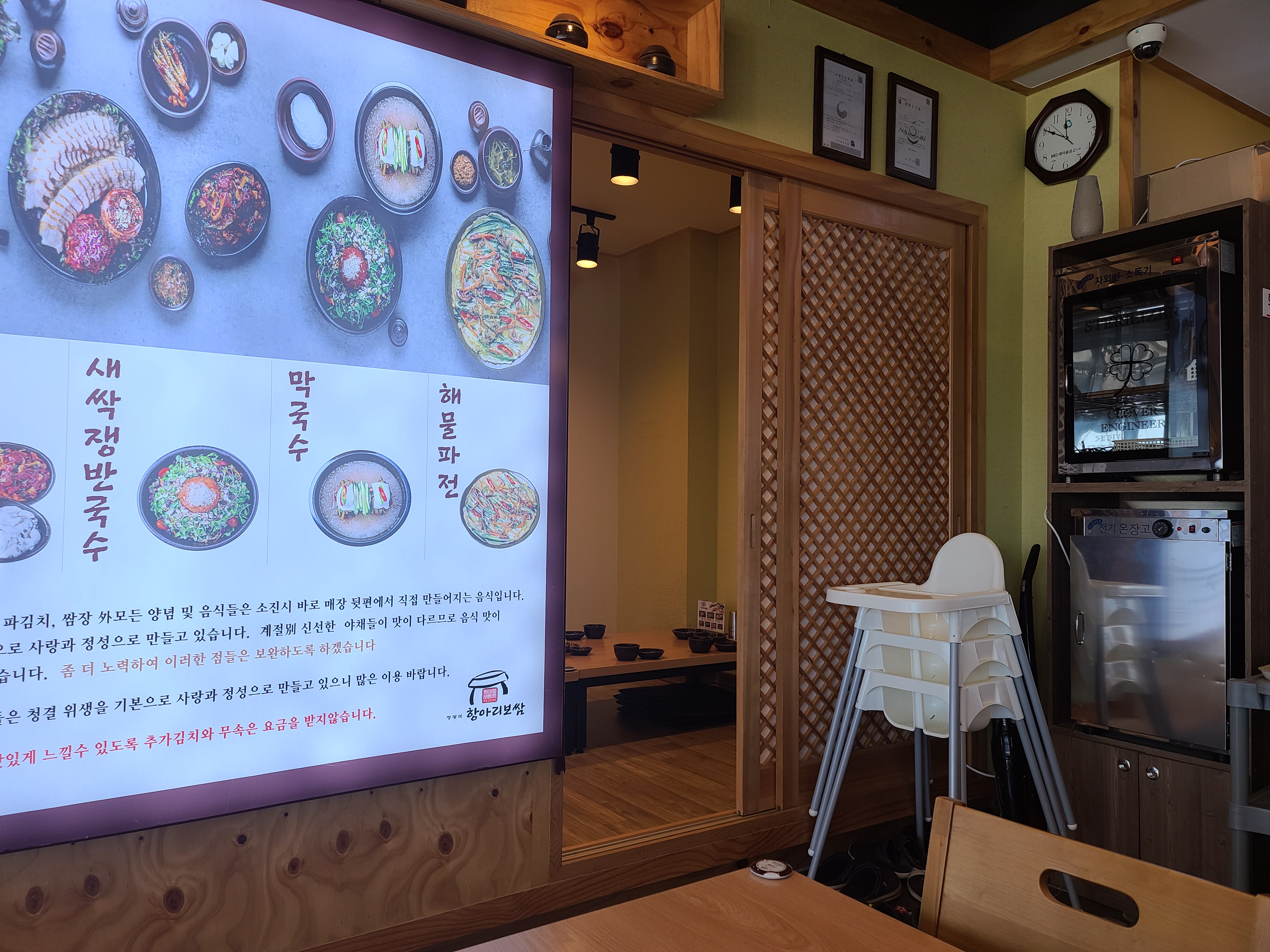 내부에 들어오면 큰 메뉴 소개판과 그 뒤로 단체를 받을 수 있는 룸도 준비되어 있다. 회식장소로도 괜찮을 거 같다.