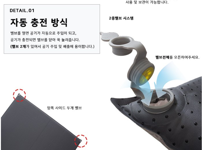 이 제품은 자충식이라 밸브만 열어두면 자동으로 바람이 들어가 ~ 열심히 펌프질 해서 공기 넣을 필요 없다는 이야기지 얼마나 좋아?