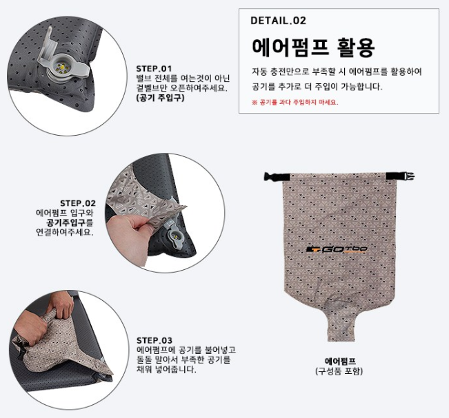 근대 또 이따 아이가 이게 밸브만 열어서 자동으로 들어가는 공기만 가지고는 에어매트가 빵빵하지가 않아 타 에어매트 제품들은 입으로 불어서 빵빵하게 만드는대 이 제품은 간이 에어펌프가 포함해서 오기 때문에 입으로 안 불어 도되 개꿀?