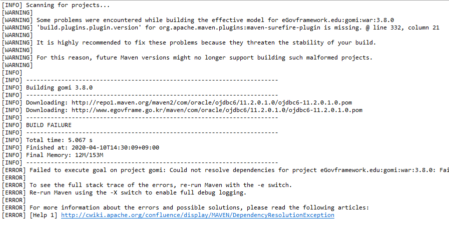 Maven 인스톨 시 아래와 같이 메시지가 나올 경 우 pom.xml에 ojdbc다운로드 제공 레파지토리가 잘못된 것이다.