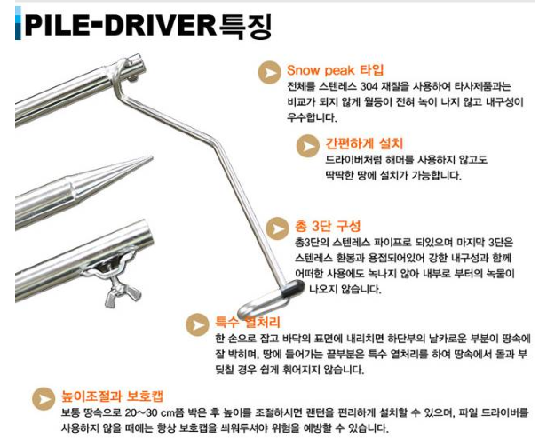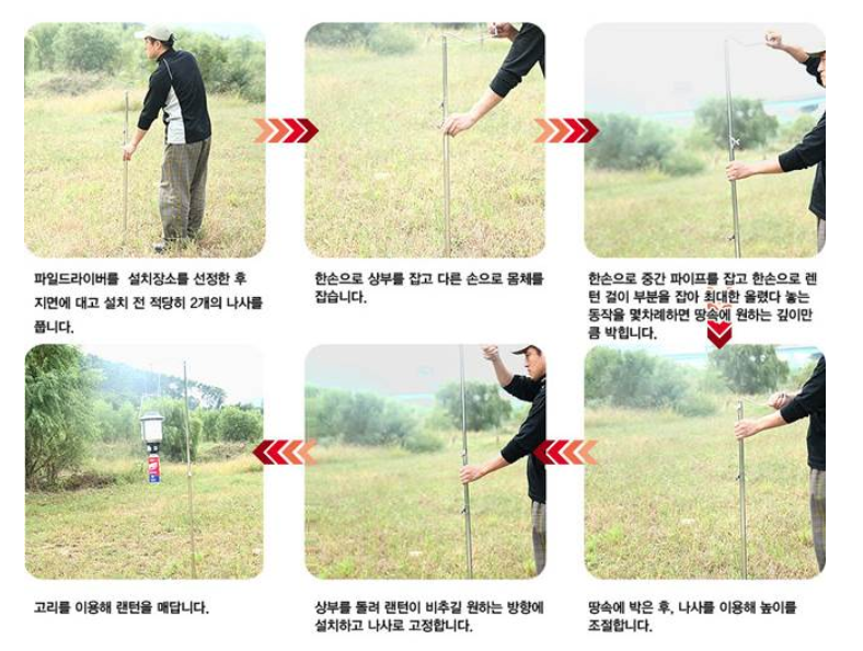 한 손으로 중간 파이프를 잡고 한손으로 렌턴 걸이 부분을 잡아 최대한 올렸다 놓는 동작을 몇 차례 하면 땅속으로 박힌다.