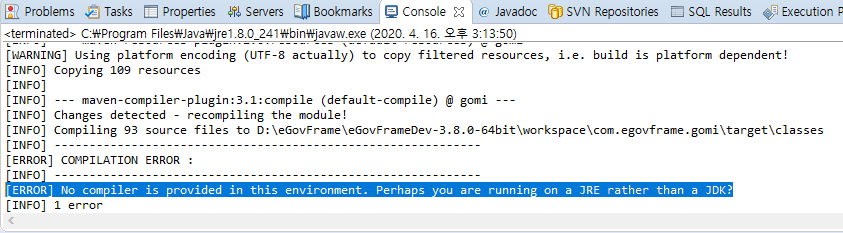 에러 해결을 위해서는 JRE가 아닌 JDK(Java Development Kit)로 변경해야 한다고 한다.