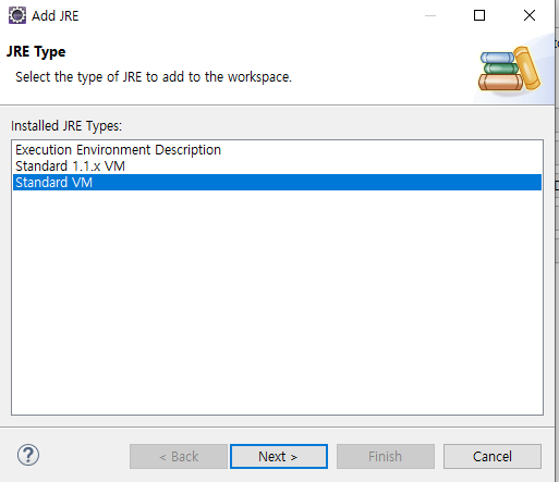 이클립스에는 기본적으로 자바 실행 도가가 JRE(Java Runtime Environment)fh 연결 되어 있다.