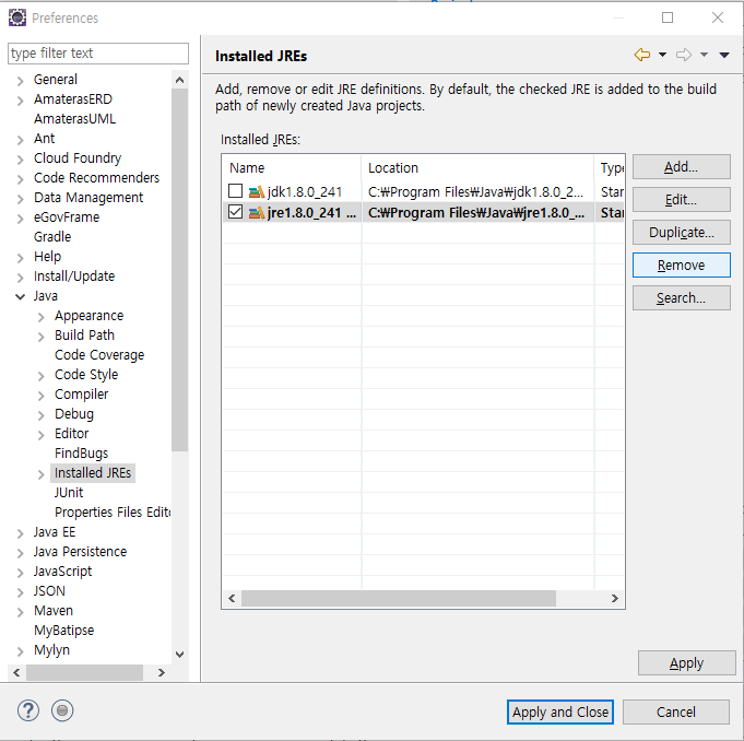 기존에 있던 Jre는 Remove로 삭제 후 적용 Apply