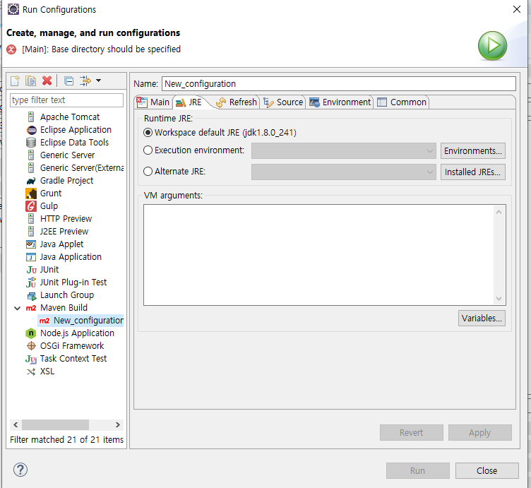 Maven Buid > New_configuration 으로 이동 후 JRE텝에서 Workspace default JRE의 버전이 바뀌었는지 확인한다.