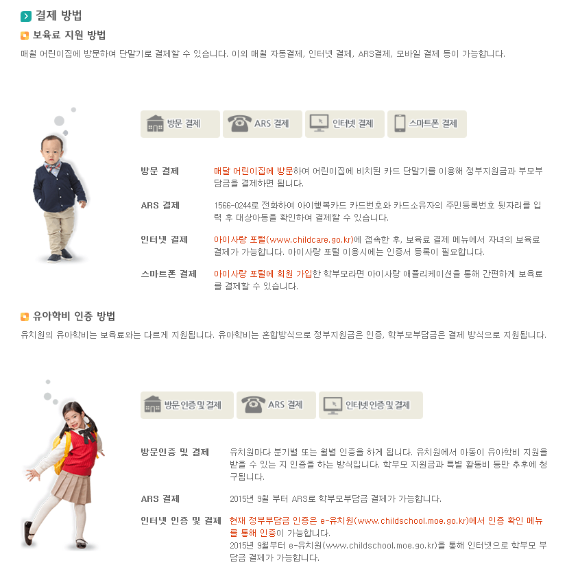 - 보조금 신청 : 정부 보조금을 신청하면 어린이집 보육료와 유치원 유아학비 인증이 가능합니다.