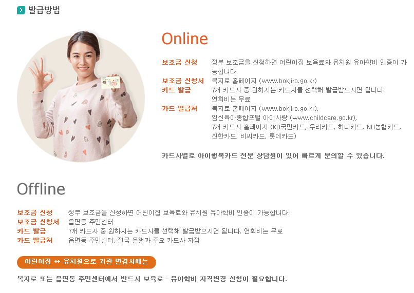 - 카드 발급처 : 7개 카드사 홈페이지, 복지로 홈페이지(www.bokjiro.go.kr), 임신육아종합포털 아이사랑(www.childcare.go.kr)