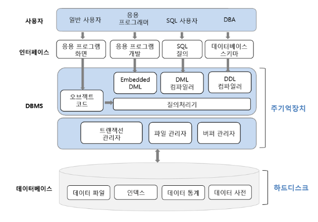- DBMS : 데이터 복구, 보안, 동시성 제어, 데이터 관리등 관리기능을 수행