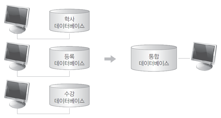 - 데이터를 통합하는 개념으로, 각자 사용하던 데이터의 중복을 최소화하여 중복으로 인한 데이터 불일치 현상을 제거