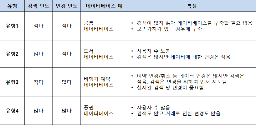 ㅇ 검색과 변경 빈도에 따른 데이터베이스 유형