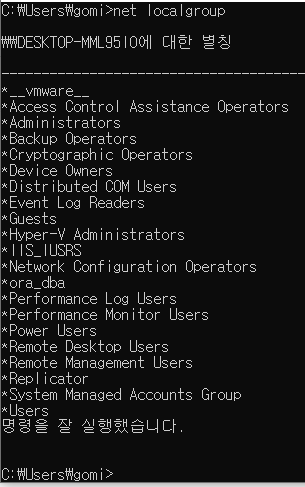 • 윈도우에서 시스템에 존재하는 그룹 목록 확인 : net localgroup