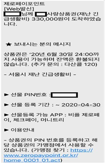 - 지원금 도착 알림으로 자연스럽게 인터넷 주소 클릭 유도하는 방식 많아
