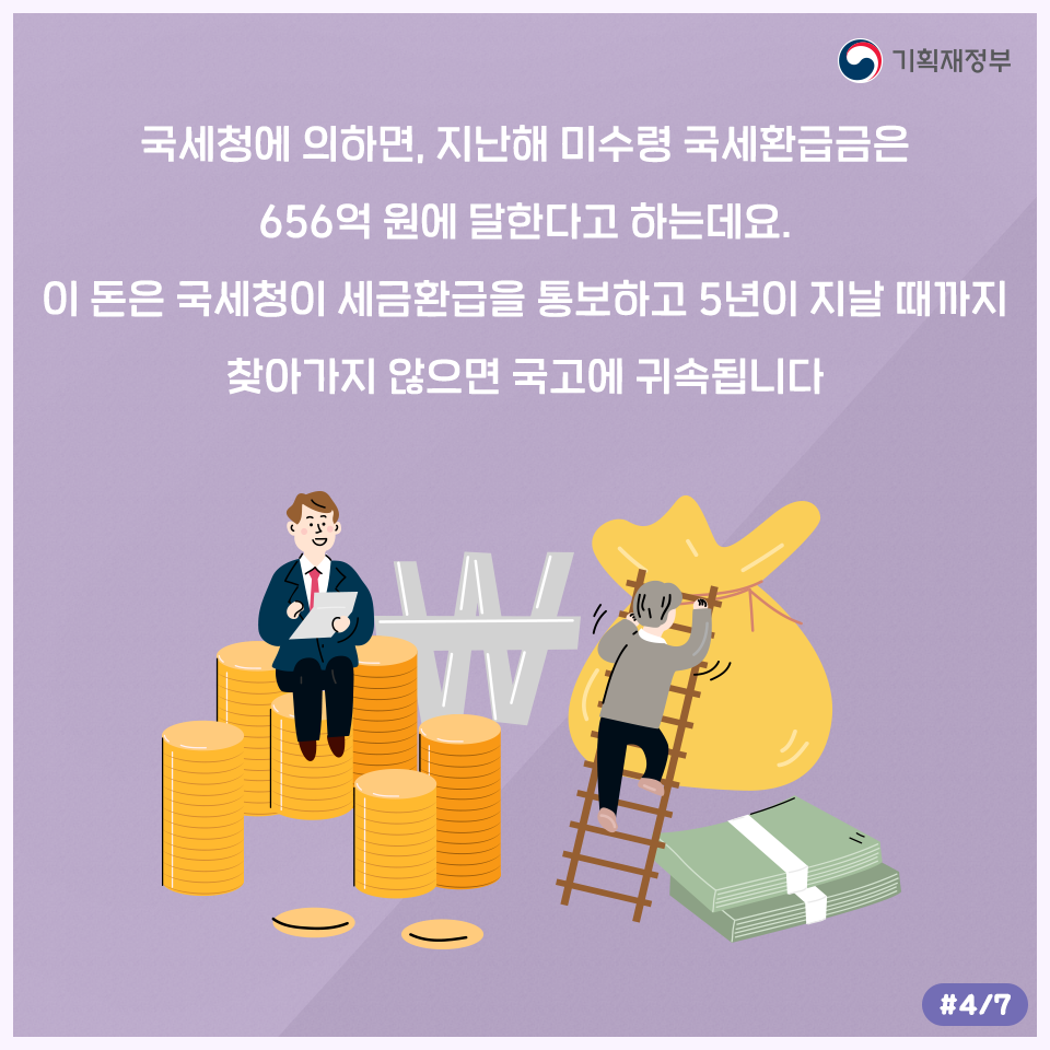이 돈은 국세청이 세금환급을 통보하고 5년이 지날 때까지 찾아가지 않으면 국고에 귀속됩니다.