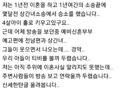 A씨는 "어린 아들에게만큼은 아빠에 대한 나쁜 이미지를 심어주고 싶지 않아 좋은 말만 했었는데 행여 방송에 나오는 것을 아들이 보게 돼 받게 될 상처가 너무 걱정된다" 해당 방송이 되지 않기를 바란다고 호소했다.
