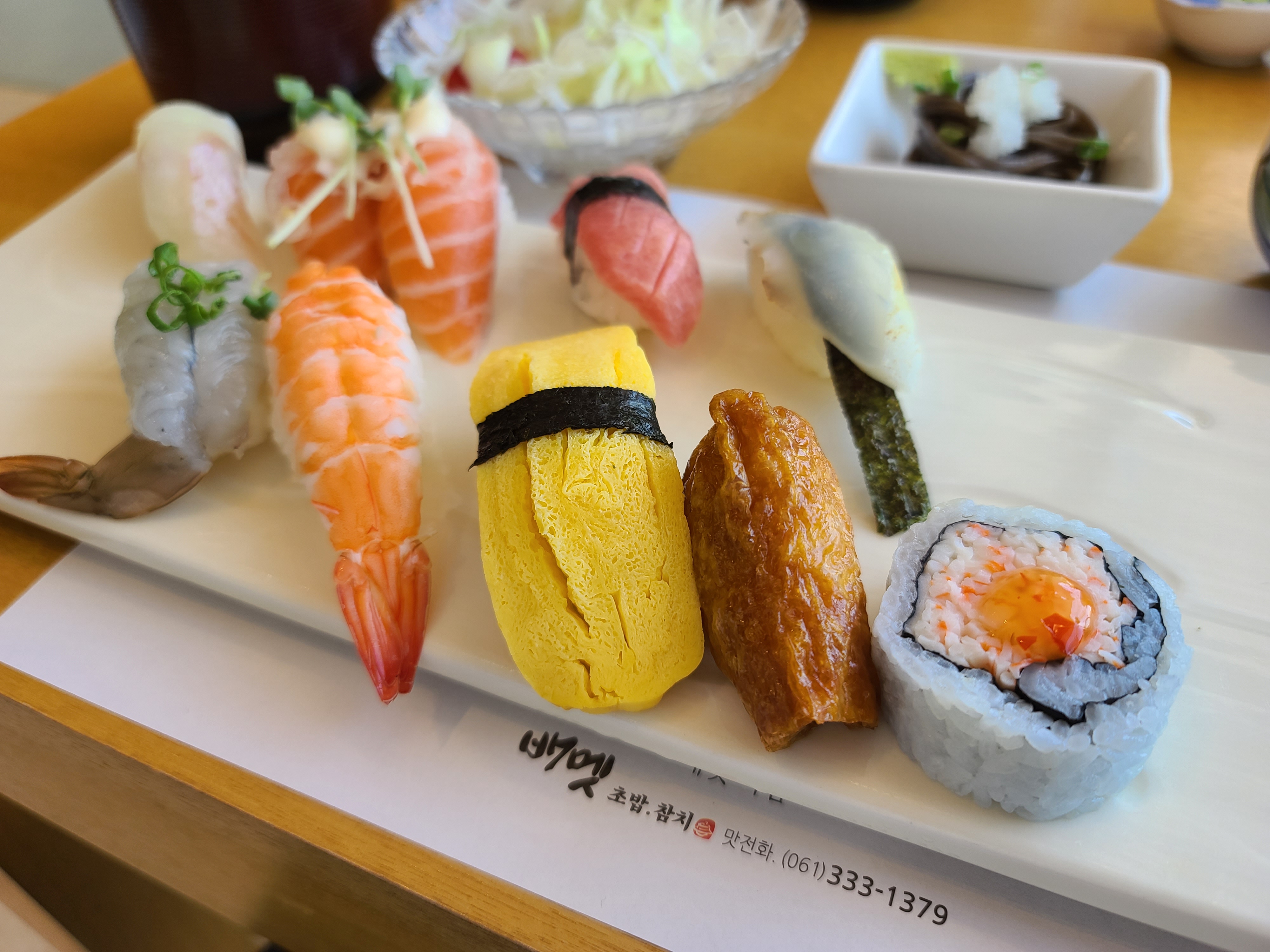 초밥 구성으로 새우초밥, 오도리초밥, 계란초밥, 유부초밥, 롤, 한치초밥, 참치초밥, 연어초밥2피스, 광어초밥 이렇게