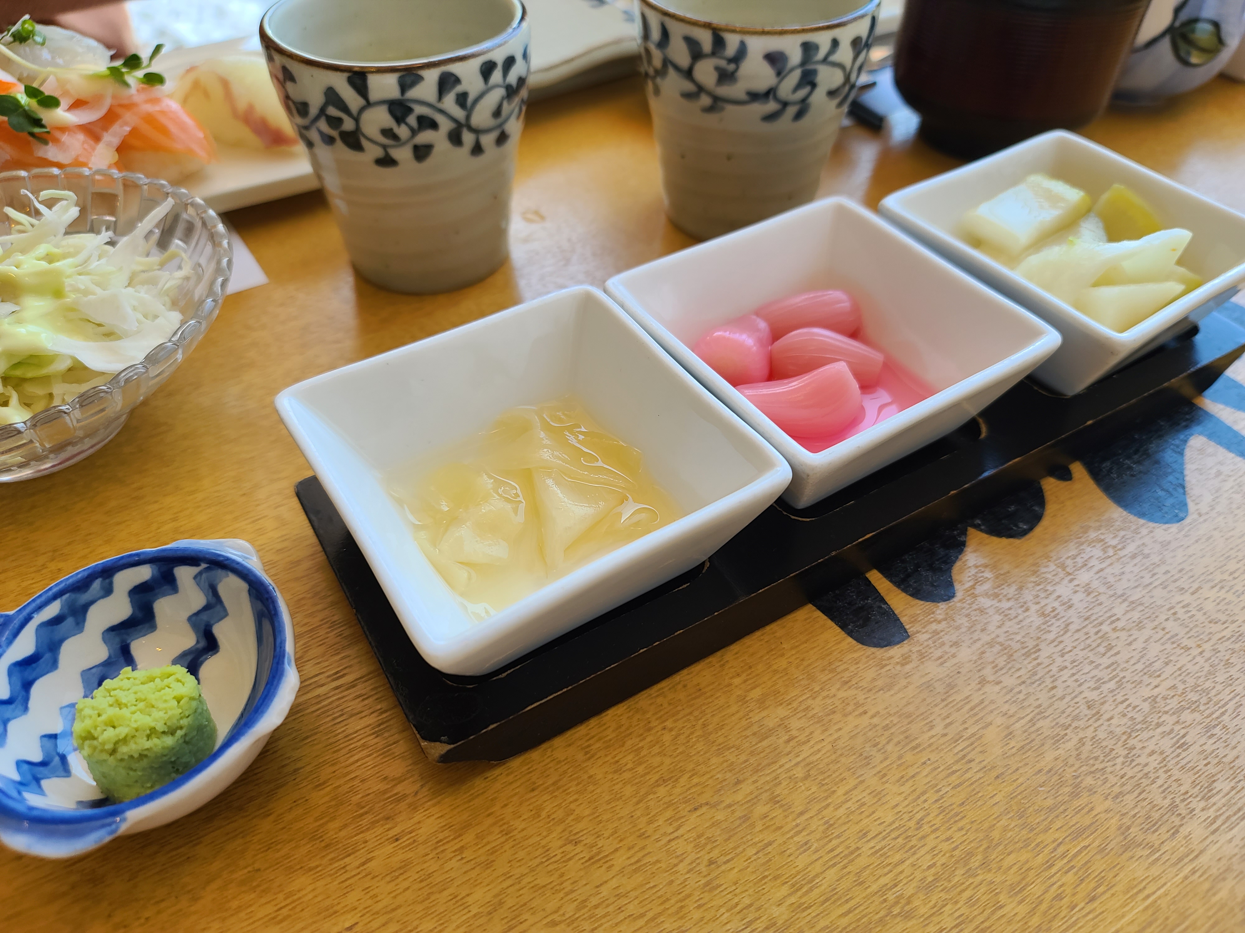 기본 반찬으로 생강, 락교, 무절임?, 와사비, 양배추셀러드 등이 나온다.