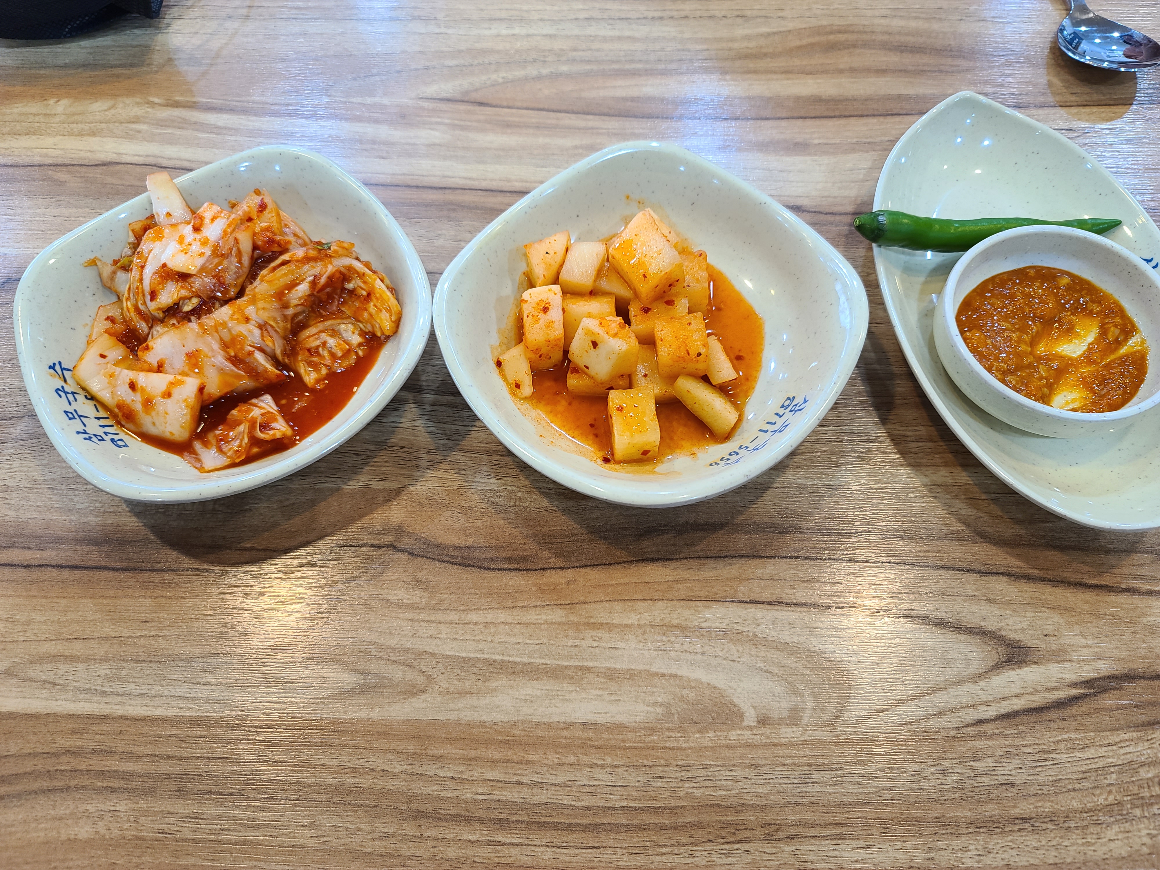기본 반찬으로 나오는 깍두기, 김치 청양고추 사진엔 없지만 어묵 국물도 같이 나온다.
