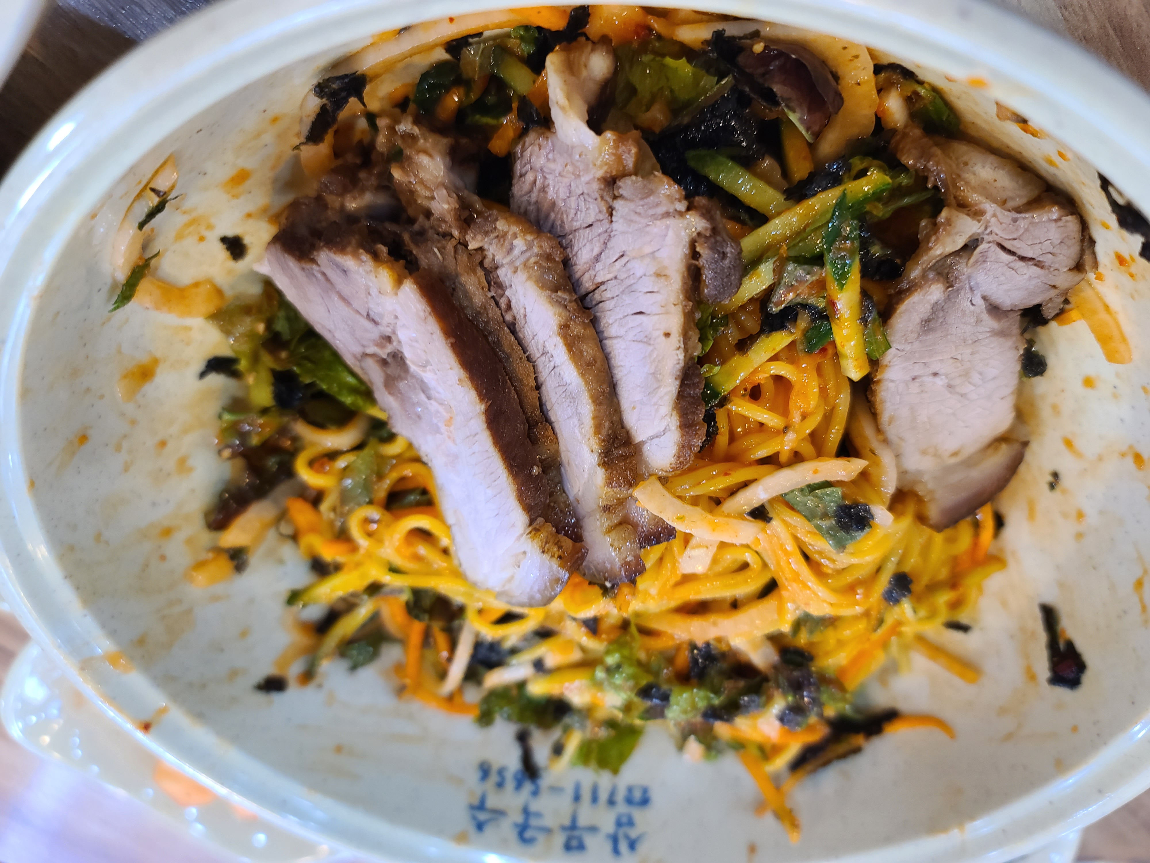 고기 비빔국수를 열심히 비볐는데, 뭔가 이상하다.. 고기 비빔국수 인대 고기가 없다.