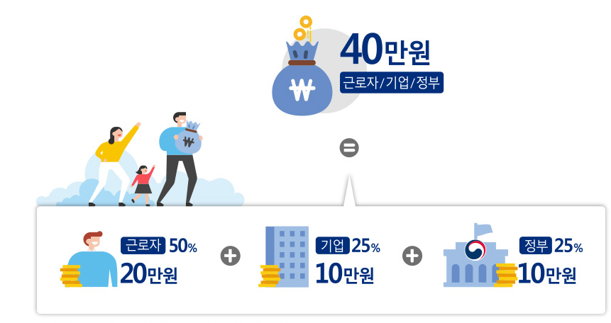 기업담당자참여신청 > 참여확정 > 참여근로자정보입력 가상계좌로 분담금 입금 > 정부지원금 추가적립 1인당 10만원