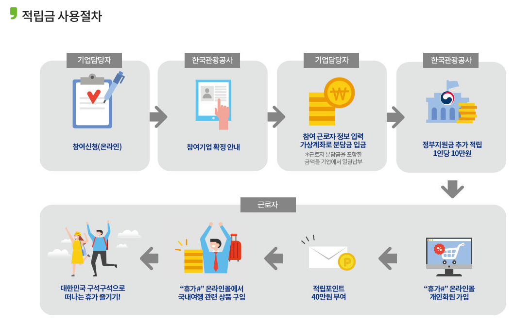 > 휴가# 온라인몰 회원가입 > 적립포인트 40만원 부여 확인 > 휴가# 온라인몰에서 국내여행 관련 상품 구입 > 대한민국 구석구석으로 휴가 즐기기