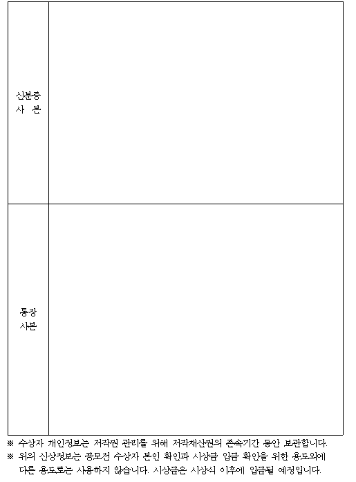 1. 입상 및 입선작품은 심사결과 발표 후 10일 이내에 통장 사본과 함께 제출하여야 함. ※ 미제출 시 수상 권리 취소