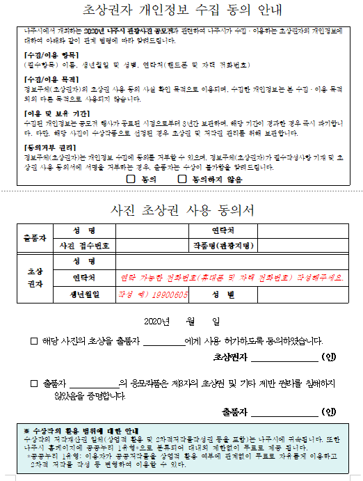 6. 응모자는 심사를 통과한 초상권 침해 가능성이 있는 응모작(개별 연락 예정)에 대하여 초상권자의 동의서를 나주시에 제출하여야 함(동의서 미제출시 심사대상에서 제외).