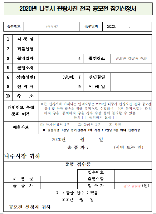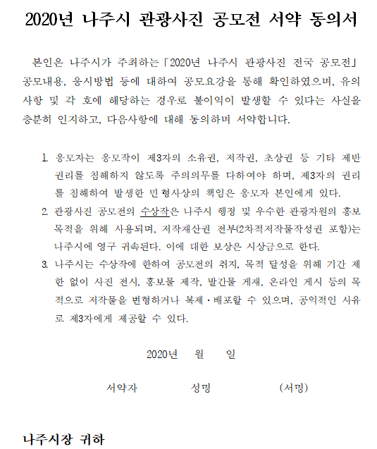 다. 2020년 나주시 관광사진 공모전 서약 동의서