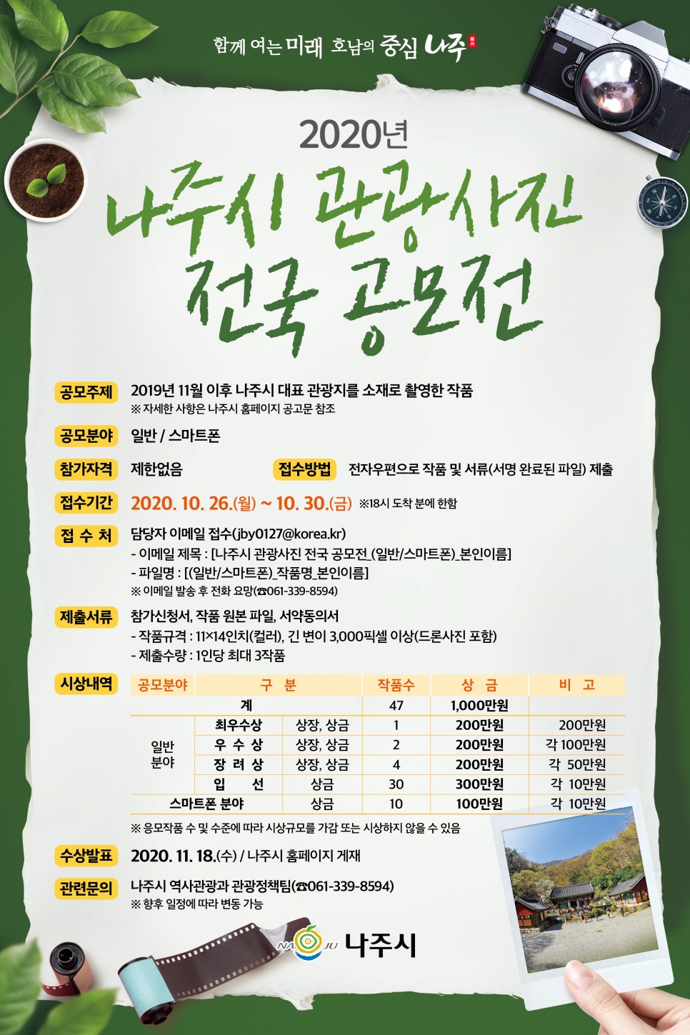 나주시의 문화,역사 명소 및 관광자원, 지역의 모습과 특성을 담은 우수한 관광사진을 아래와 같이 공모하오니, 사진 동호인 여러분의 적극적인 관심과 참여를 바랍니다. 1. 공모분야 : 2019년 11월 이후 나주시 관광자원을 소재로 한 촬영 작품 2. 접수기간 : 2020. 10. 26.(월) ~ 10.30.(금) ※18:00 도착분에 한함 3. 참가자격 : 누구나 4. 접수방법 : 전자우편으로 작품 및 서류(서명 완료된 파일) 제출