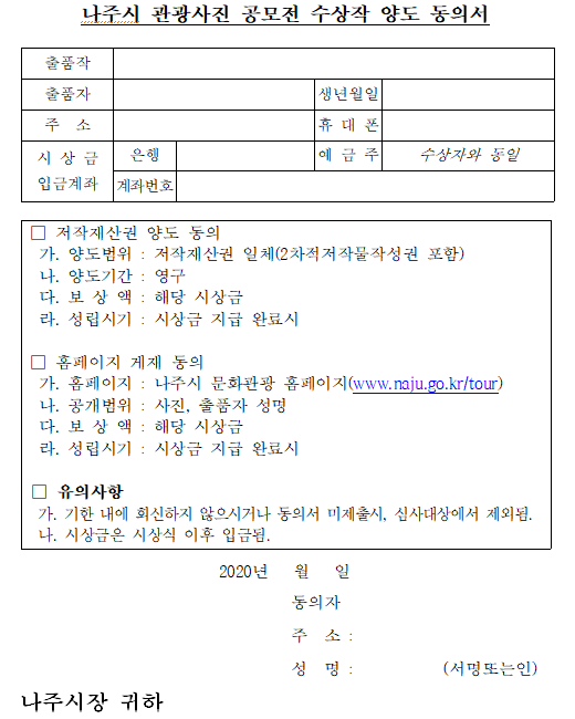 - 나주시 관광사진 공모전 수상작 양도 동의서